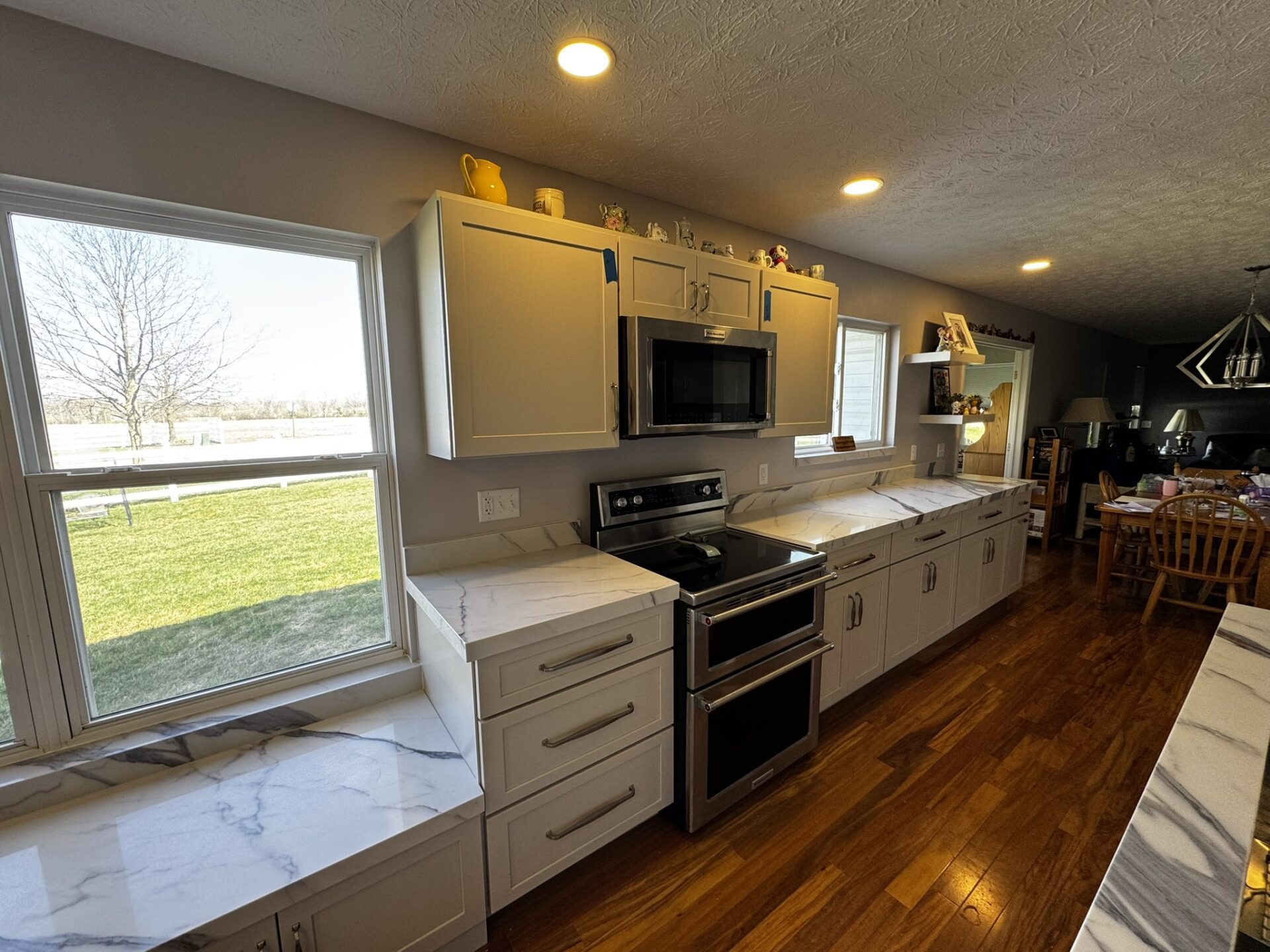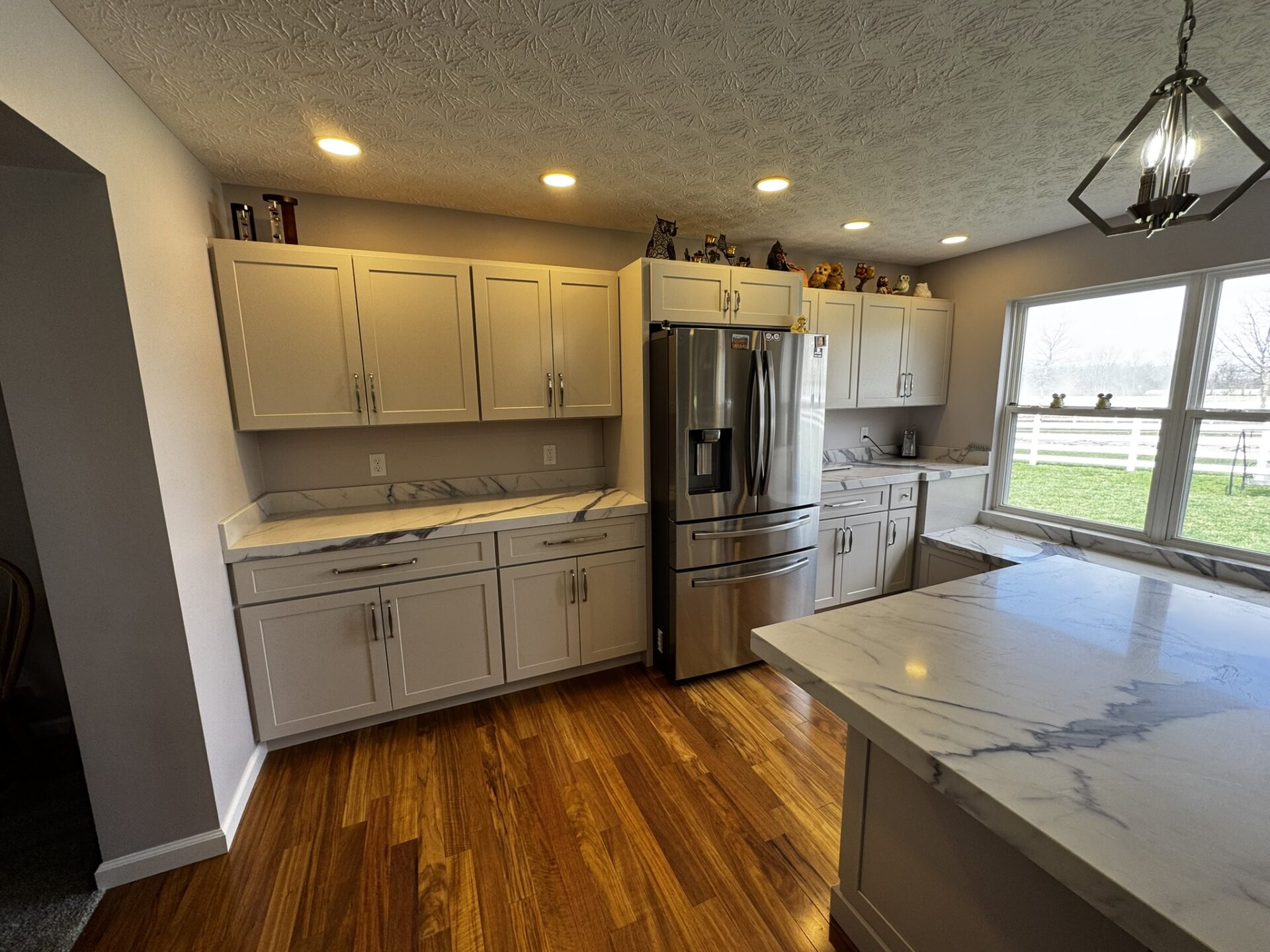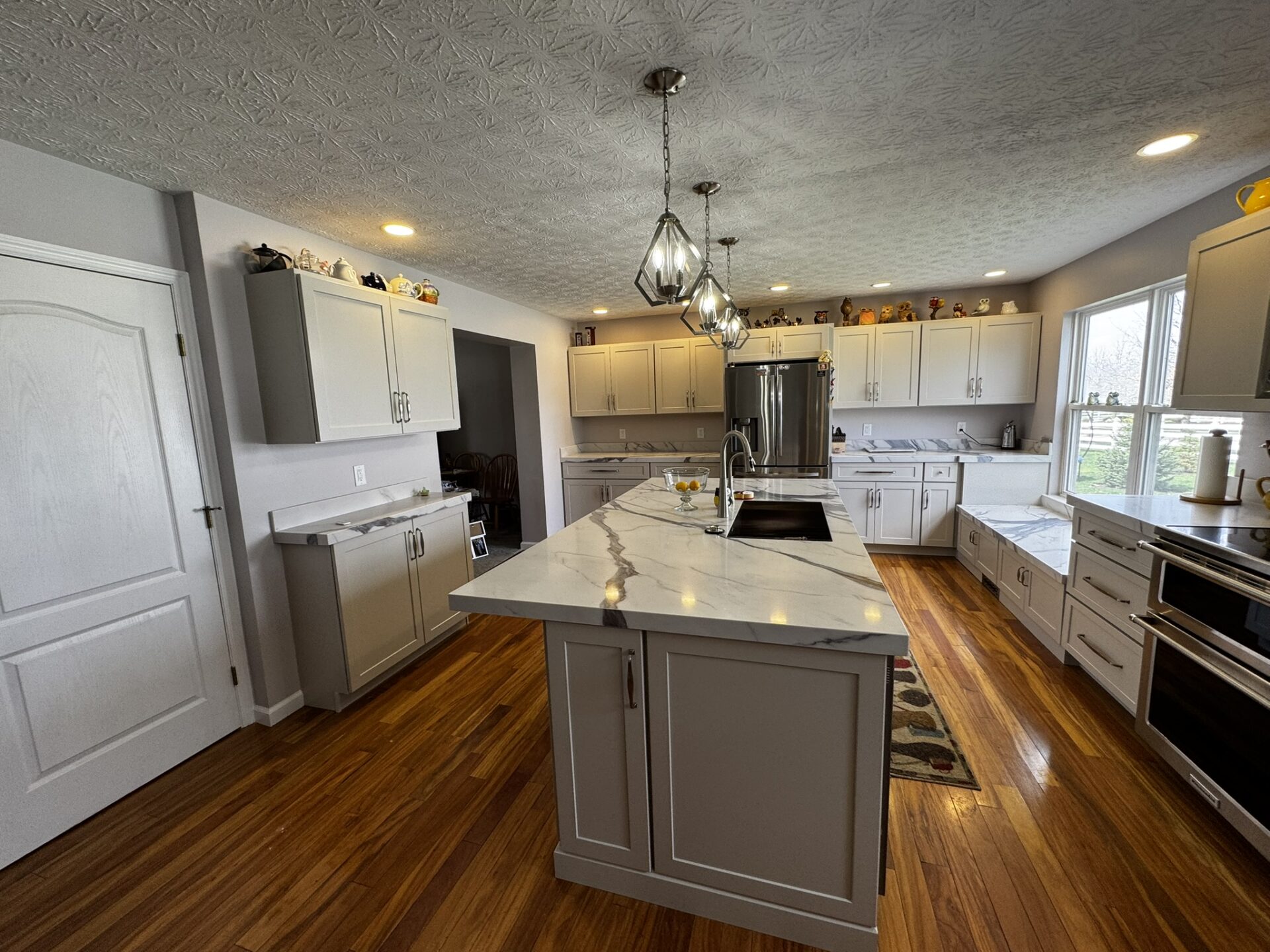 LED wafer lights were installed throughout the kitchen and pendant lights were installed above the island. We also installed undercabinet lighting throughout. All lighting was put un dimmers.