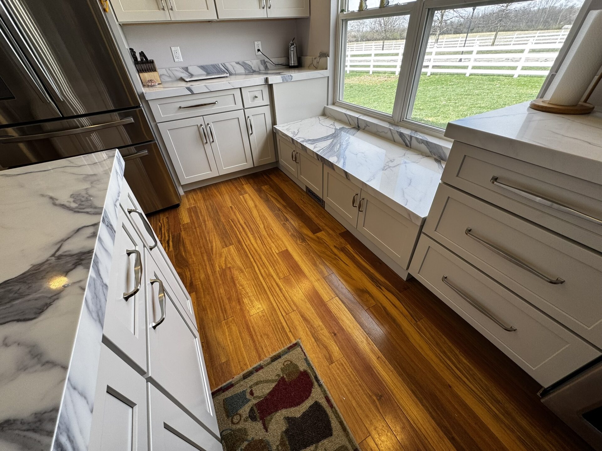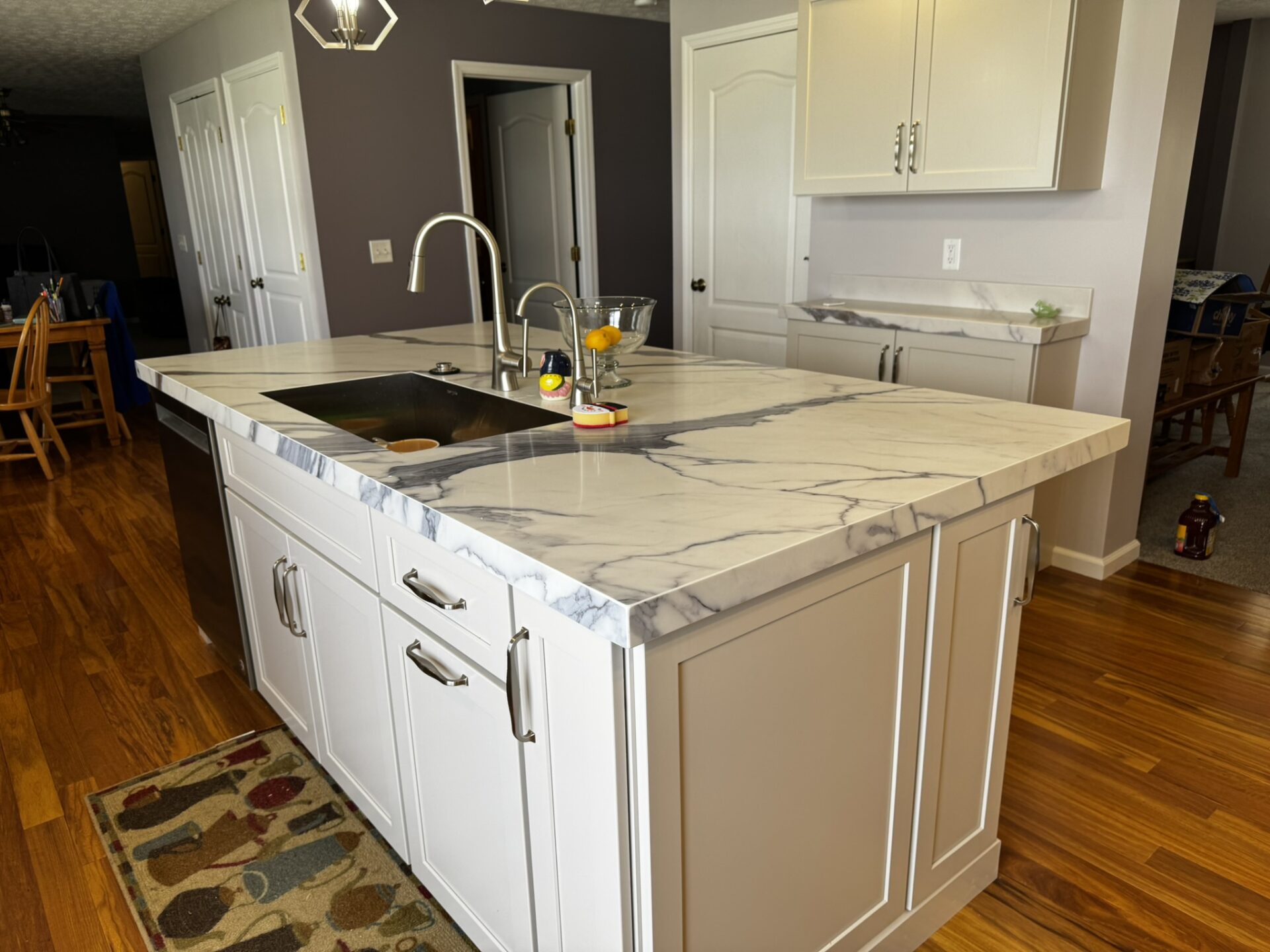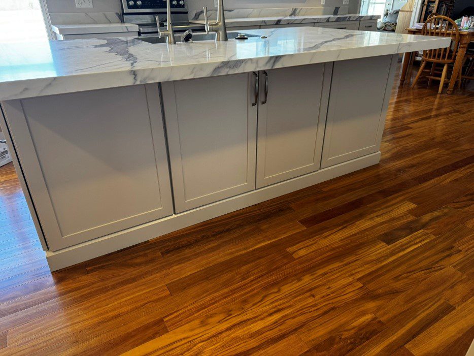 Week 3-4: Cabinets, Templating, Trim; week 3 brought the most drastic change to the project…cabinets. The space had been opened and flooring installed but once the new flooring was installed, we immediately covered it with “Ram-board” (a cardboard material used to protect surfaces), so the “wow” was only present for a few hours, then covered up. As the cabinets were installed, the size of the change became apparent and a visual of the functionality could be seen in real life as opposed to 3-D renderings, and sketches. Prior to the job ever started I needed to co-ordinate with the countertop installer/fabricator. We had to get a date on the calendar for templating. While this date is flexible, if changed it can drastically change the installation date. The installation date is built out about 7-10 days after the templating date. If we miss the templating date, there is a real possibility that we will miss the installation date due to fabrication being pushed back. If this were to happen it could add another week or two to the installation date and push everything out. Keeping the projected schedule is very important to the flow of the job. Templating occurred at the end of the week. As we rolled into week 4, cabinet installation, trim, and pulls/handles were wrapped up as the painters started. The owners repainted most of the first-floor walls, ceilings, trim, and doors due to disturbances on many surfaces. Finish painting stretched into the following week.